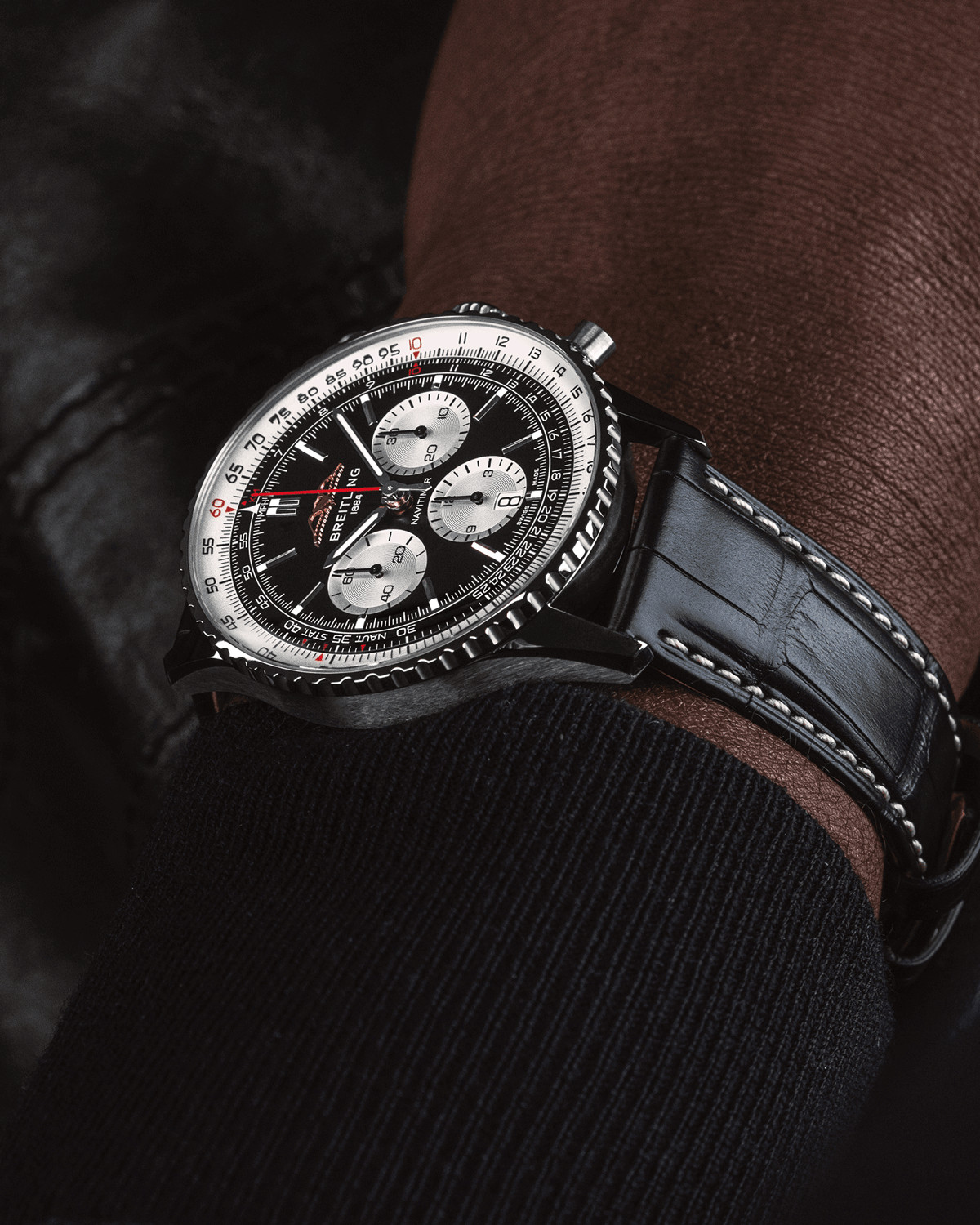 To mark the 70th anniversary of its emblematic Navitimer, Breitling is unveiling a redesigned collection. Discover this new and unique chronograph model equipped with the B01 calibre and adorned with a black dial and a black leather strap !