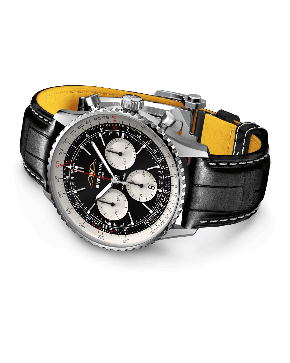 The Breitling Navitimer B01 Chronograph with its black dial and black leather strap perfectly combines tradition and modernity. Its bold design and advanced watchmaking functions make it a must-have for aviation enthusiasts and lovers of fine mechanical engineering. Whether in the air or on land, this iconic watch, with its circular slide rule and assertive style, embodies technical excellence and watchmaking elegance, a timeless classic for those who want distinguished style and a precision tool for everyday use.