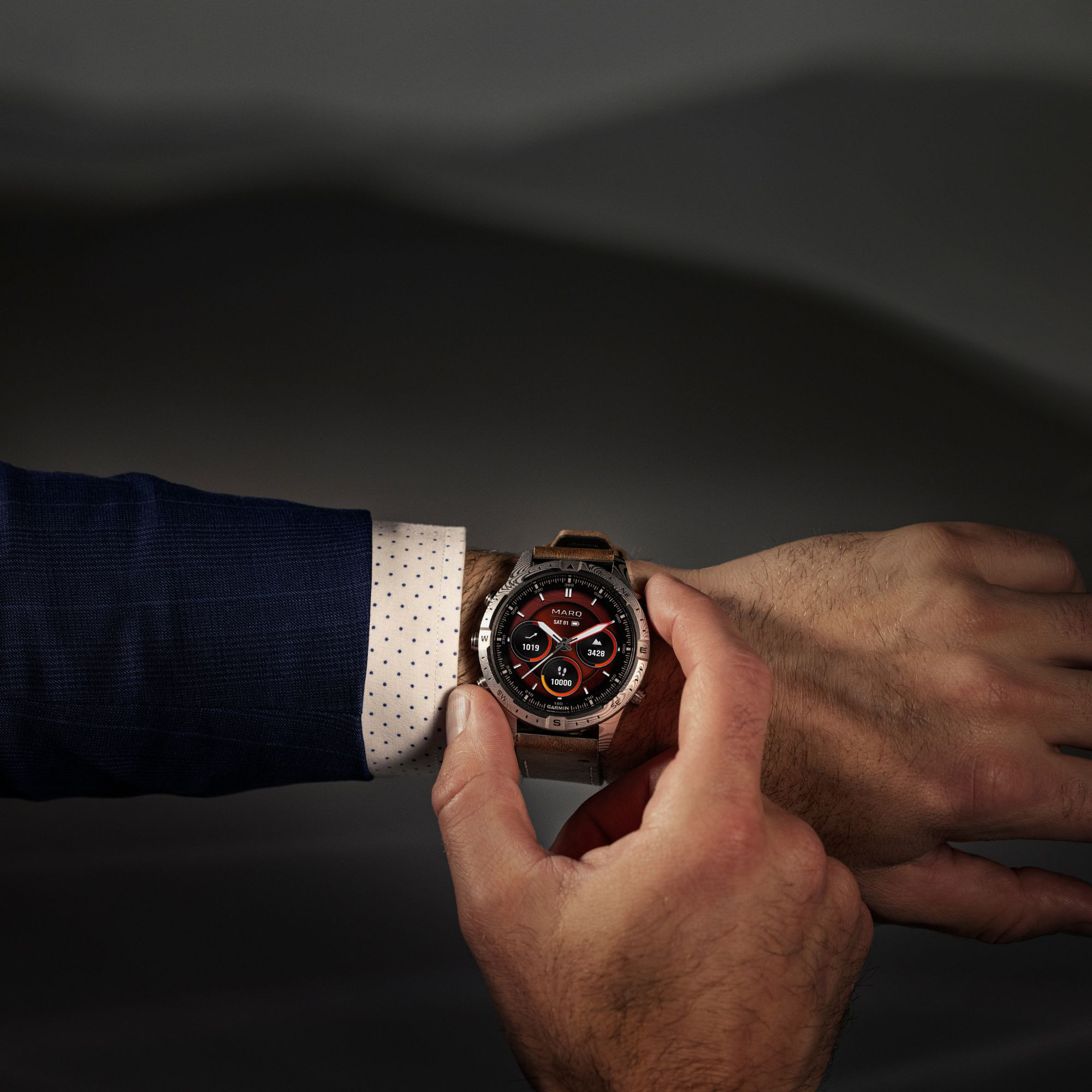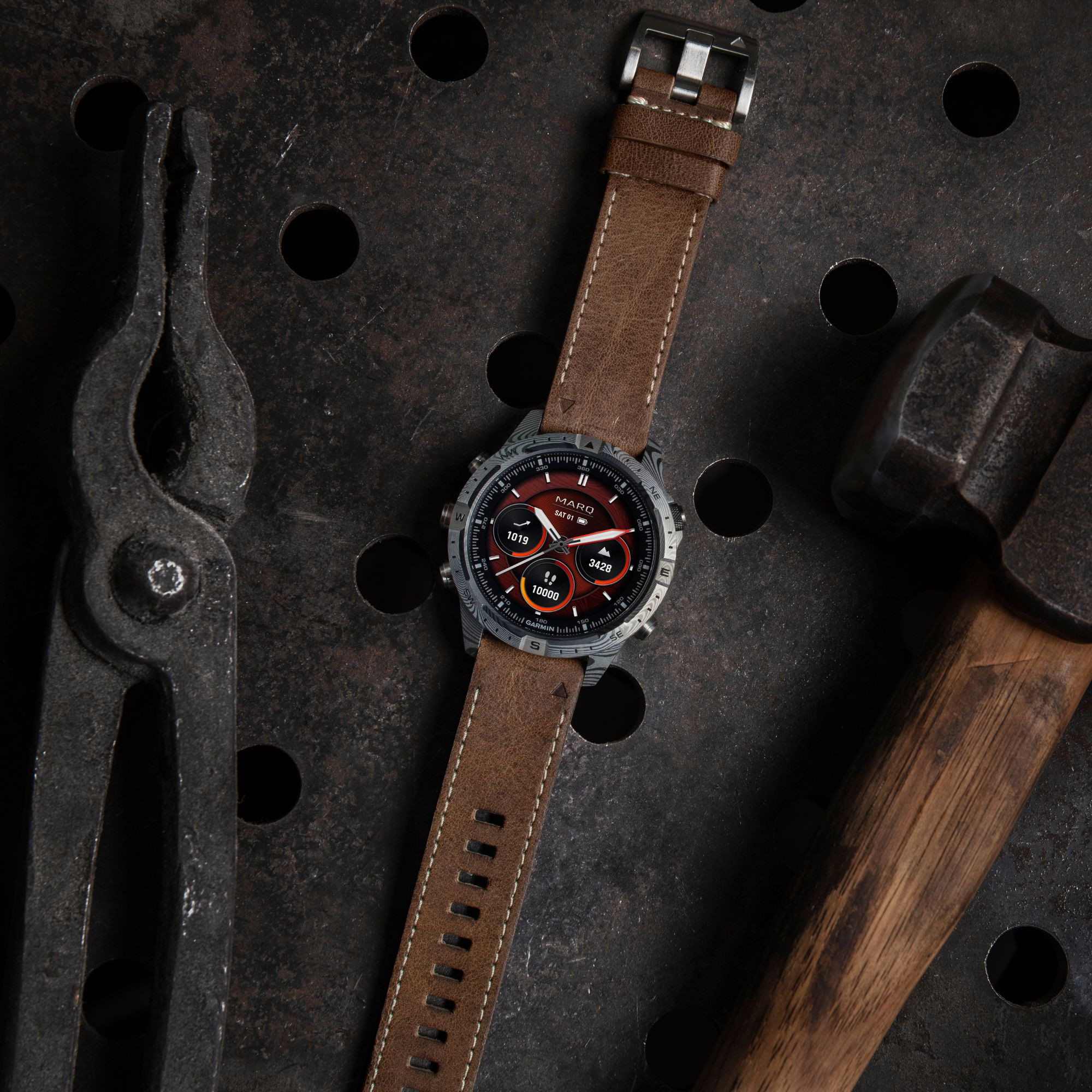 Discover the MARQ® Adventurer (Gen 2) - Damascus Steel Edition, a luxury connected watch combining tradition and innovation. Forged from damascus steel, it is the fruit of age-old craftsmanship, offering unrivalled strength and unique patterns created by layers of steel folded and twisted together. This model is designed for the discerning adventurer, with a 46mm AMOLED touchscreen protected by a domed sapphire crystal, and a hybrid leather and rubber strap, resistant to sweat and stains.