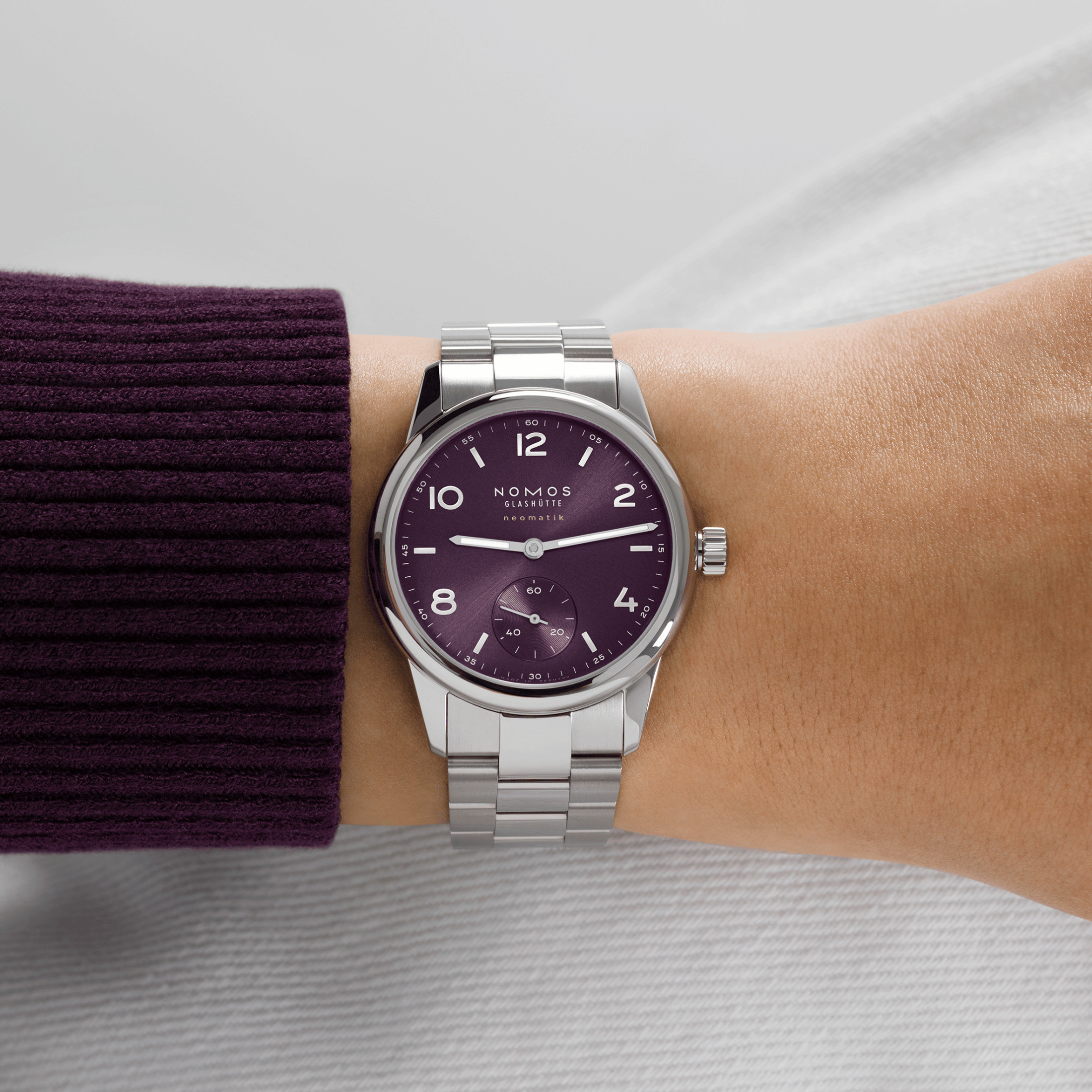 Nomos Club Sport Neomatik 34 Purple automatic steel caseback purple dial steel bracelet 34 mm
