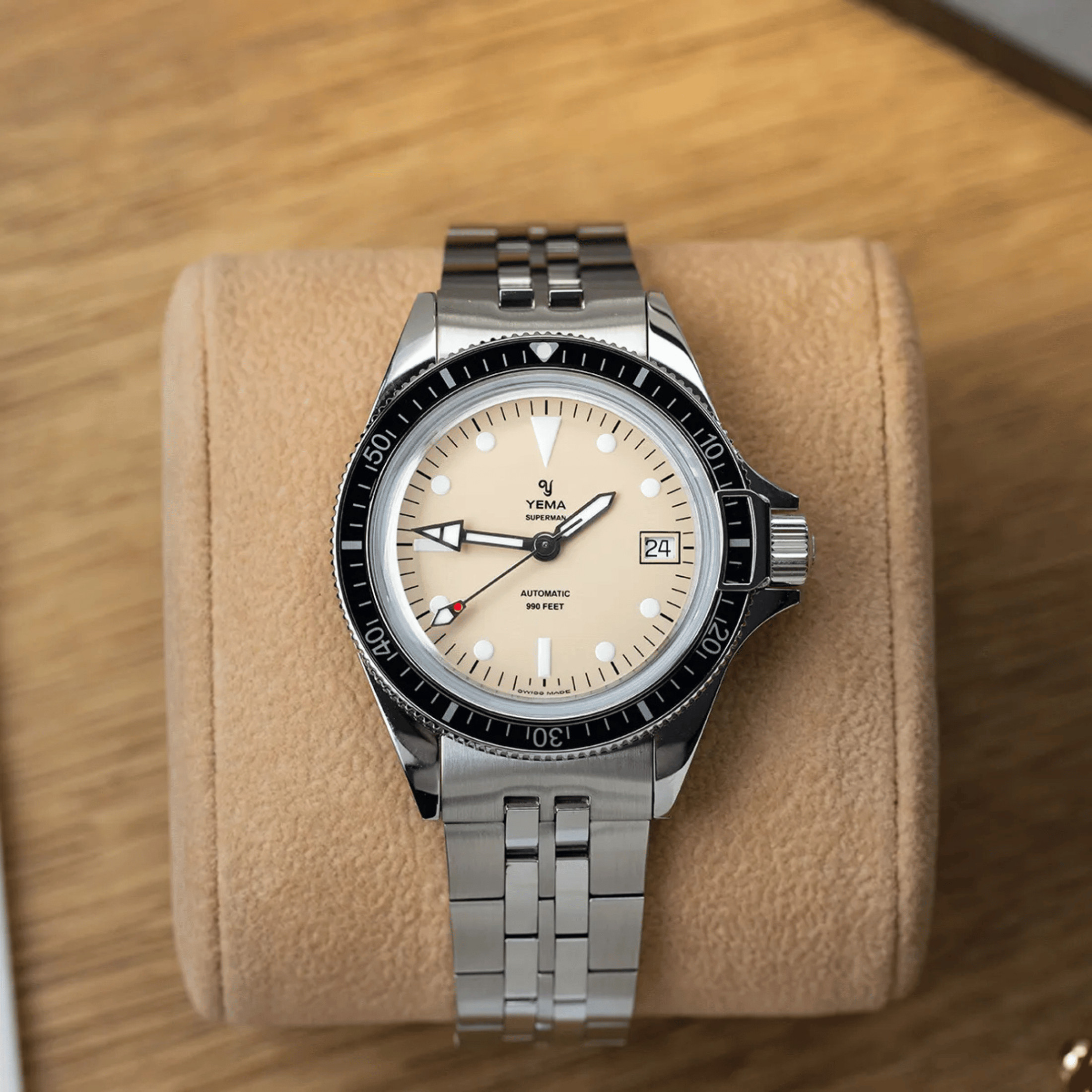 The Yema Superman Swiss Edition 41 mm beige dial asserts its vintage character with a patinated dial that evokes the charm of antique watches. The subtle shades of beige, giving the impression of a watch that has stood the test of time, give this model originality and a striking presence on the wrist. The 41 mm case, ideal for larger wrists, reinforces the robust, authentic allure of this timepiece.
