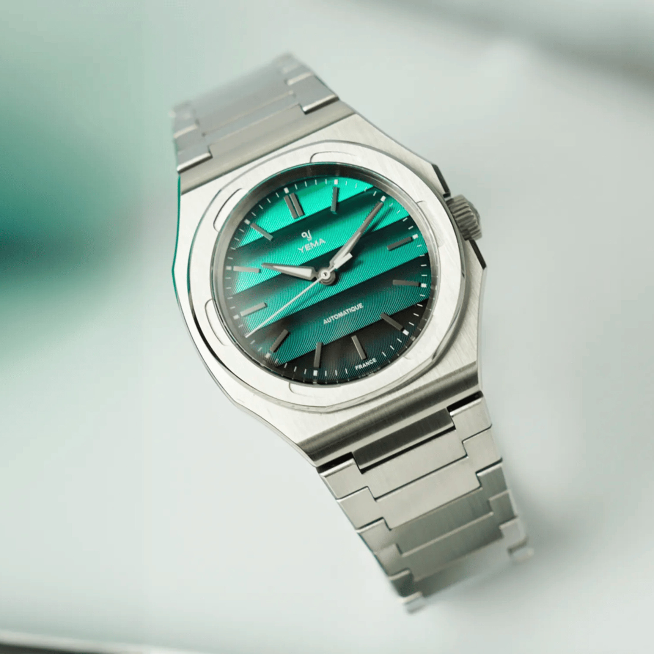 The Yema Wristmaster Traveller is distinguished by its deep, luminous emerald-green dial. This elegant yet bold hue gives the watch a unique, assertive character. The dial, adorned with a stylized “Côtes de Genève” finish, captures the light with subtlety, while the polished/faceted hour-markers and hands ensure optimal legibility. The asymmetrical octagonal stainless steel case, integrated bracelet and in-house YEMA2000 caliber testify to the expertise and quality of this watch designed for the modern adventurer.