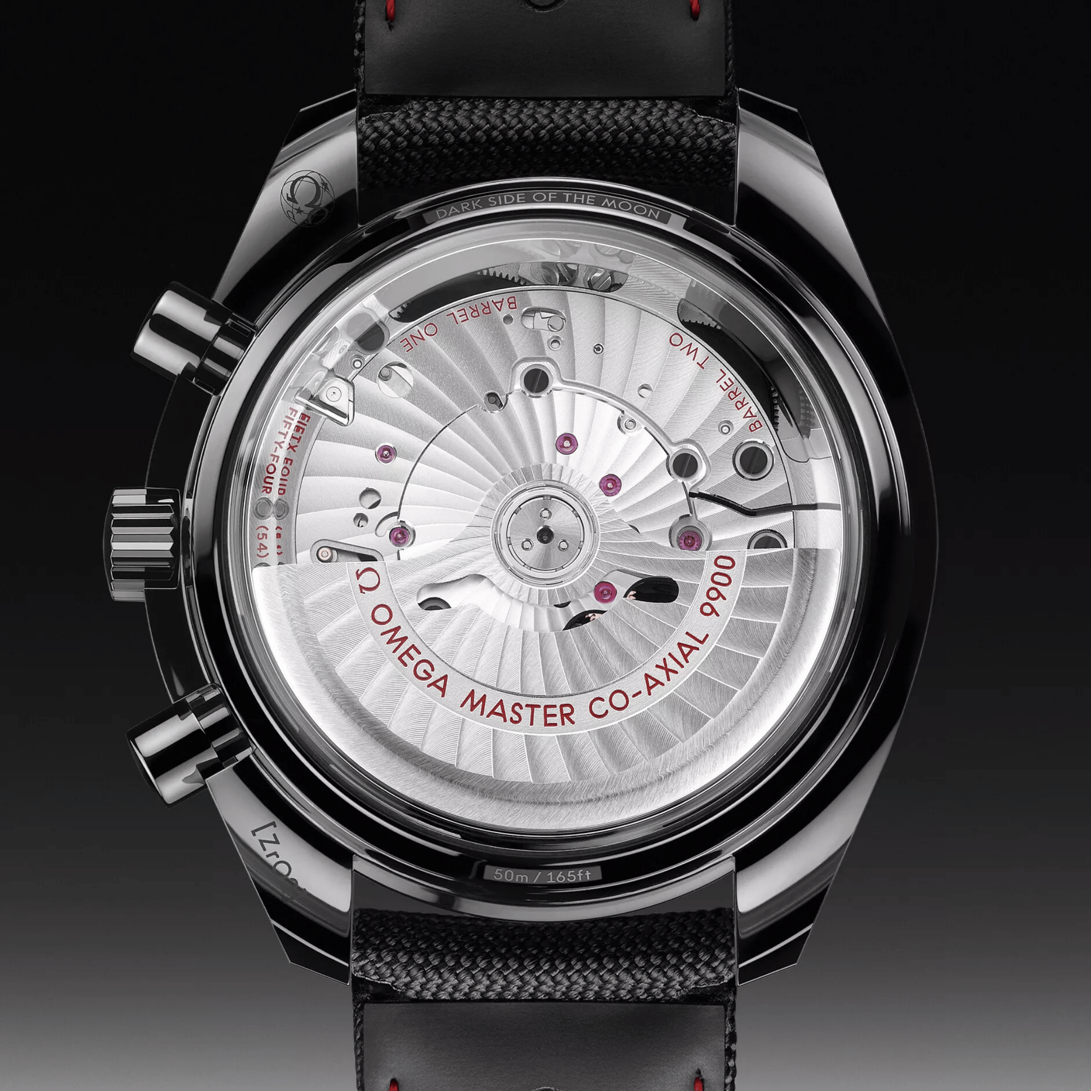 A matching red lacquer accent highlights the Speedmaster inscription — a subtle yet vibrant nod to the model’s sporting and spacefaring heritage, like a pulse of color in the dark.