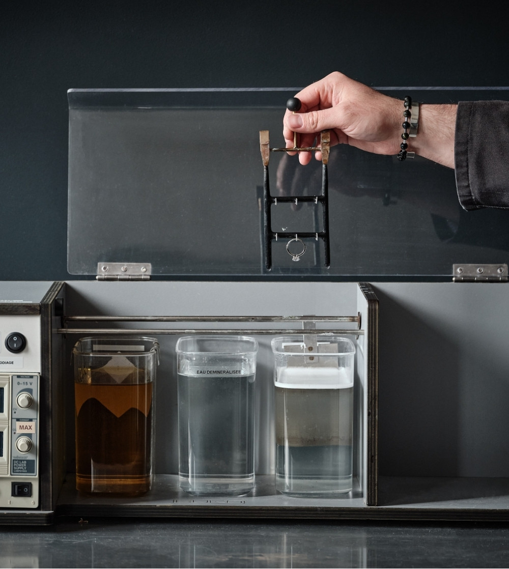 At this stage, the work of our jewellers consists of removing all visible traces left by the previous stages of manufacture. To do this, the piece will pass through several machines, then be brushed and embalmed with polishing paste. Once the polishing is done, if the jewel is made of white gold or platinum, it will be immersed in a rhodium bath for a few minutes, in order to freeze, whiten and reinforce its white shine.