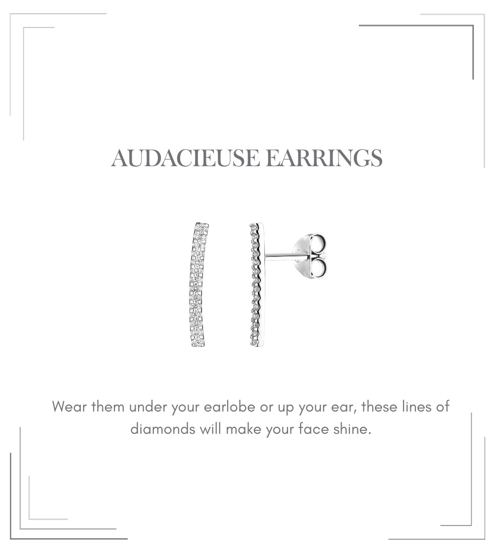 The main aim of our collection is to offer jewellery with a strong personality, but designed to be worn every day. Like these emblematic earrings, each piece in the Audacieuse line is meticulously designed to combine aesthetics and practicality, accompanying you with elegance from sunrise to sunset, whether it's an ordinary day or an exceptional event.