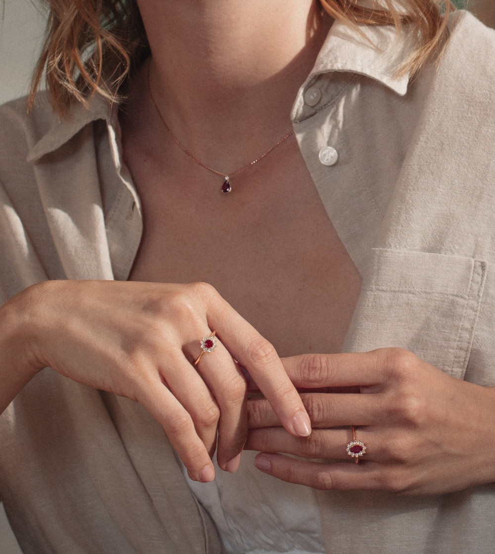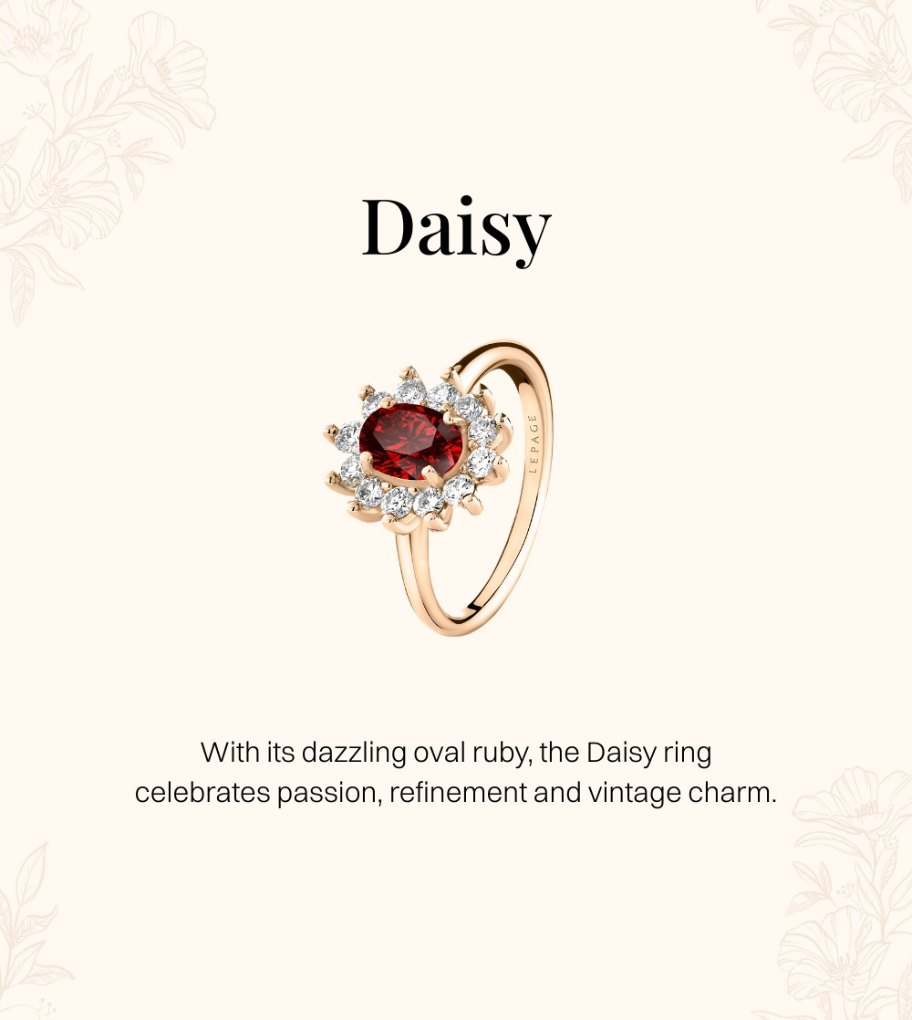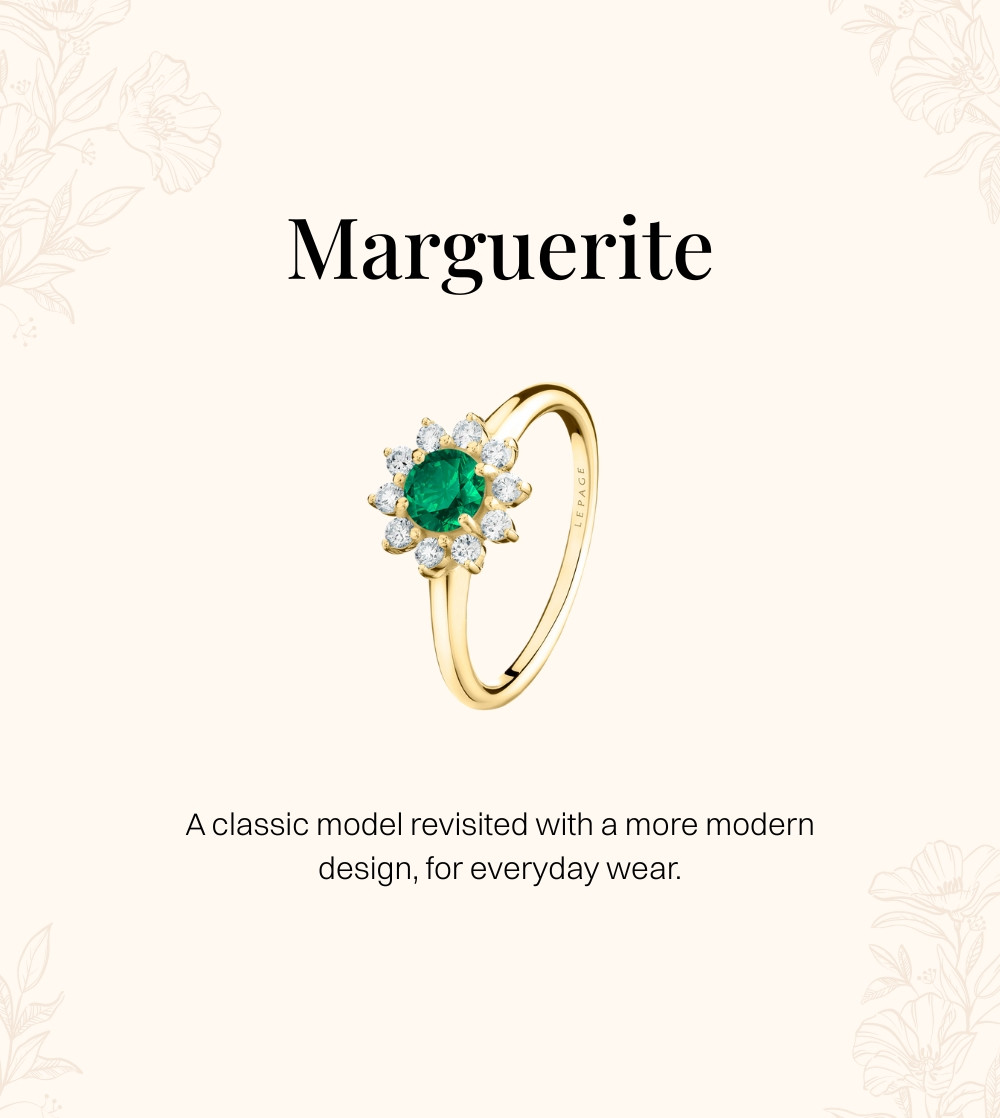 In the refined setting of the Suzanne collection, the Marguerite ring blossoms like an eternal flower, shaped by the artistry of fine jewelry. Its precious heart is adorned in turn with a pristine diamond, pure as the morning light, a deep sapphire whispering the serenity of azure skies, a vibrant emerald echoing the promise of spring, or a fiery ruby igniting the soul with passion. Set in the silvery glow of white gold, the warmth of yellow gold, or the softness of rose gold, all in 18k, these gemstones shimmer within a halo of diamonds — petals of light enhancing their beauty. Each variation reveals its own unique personality, yet all share the same timeless charm: that of a flower born from the past and reimagined for the woman of today, carrying within it the poetry, elegance, and emotion of the finest jewels of tradition.