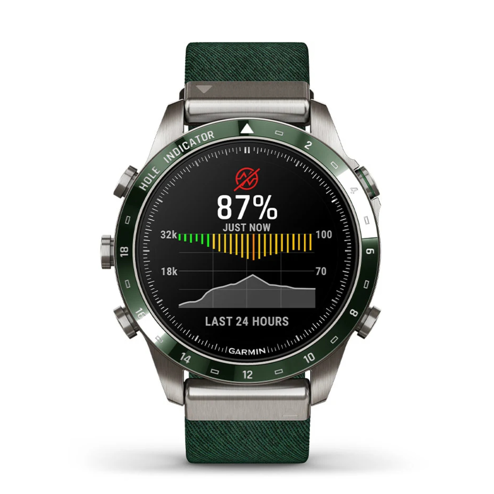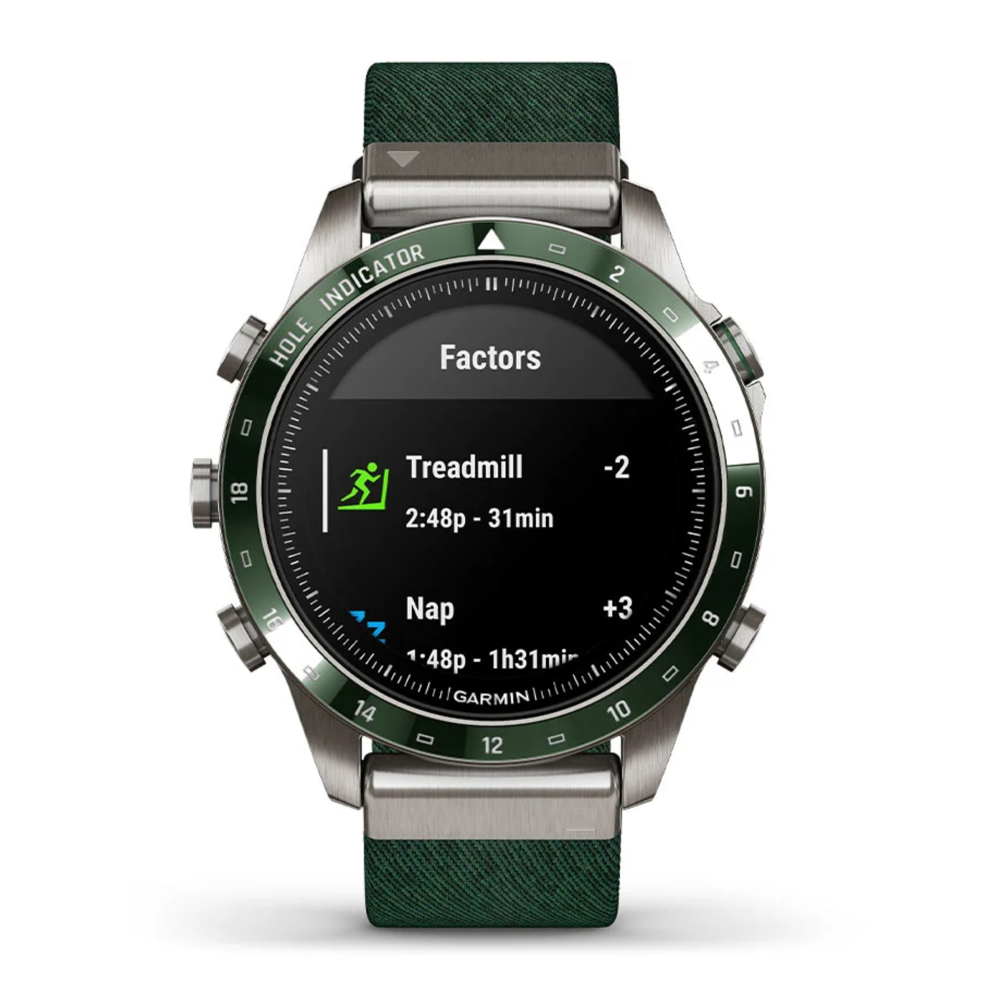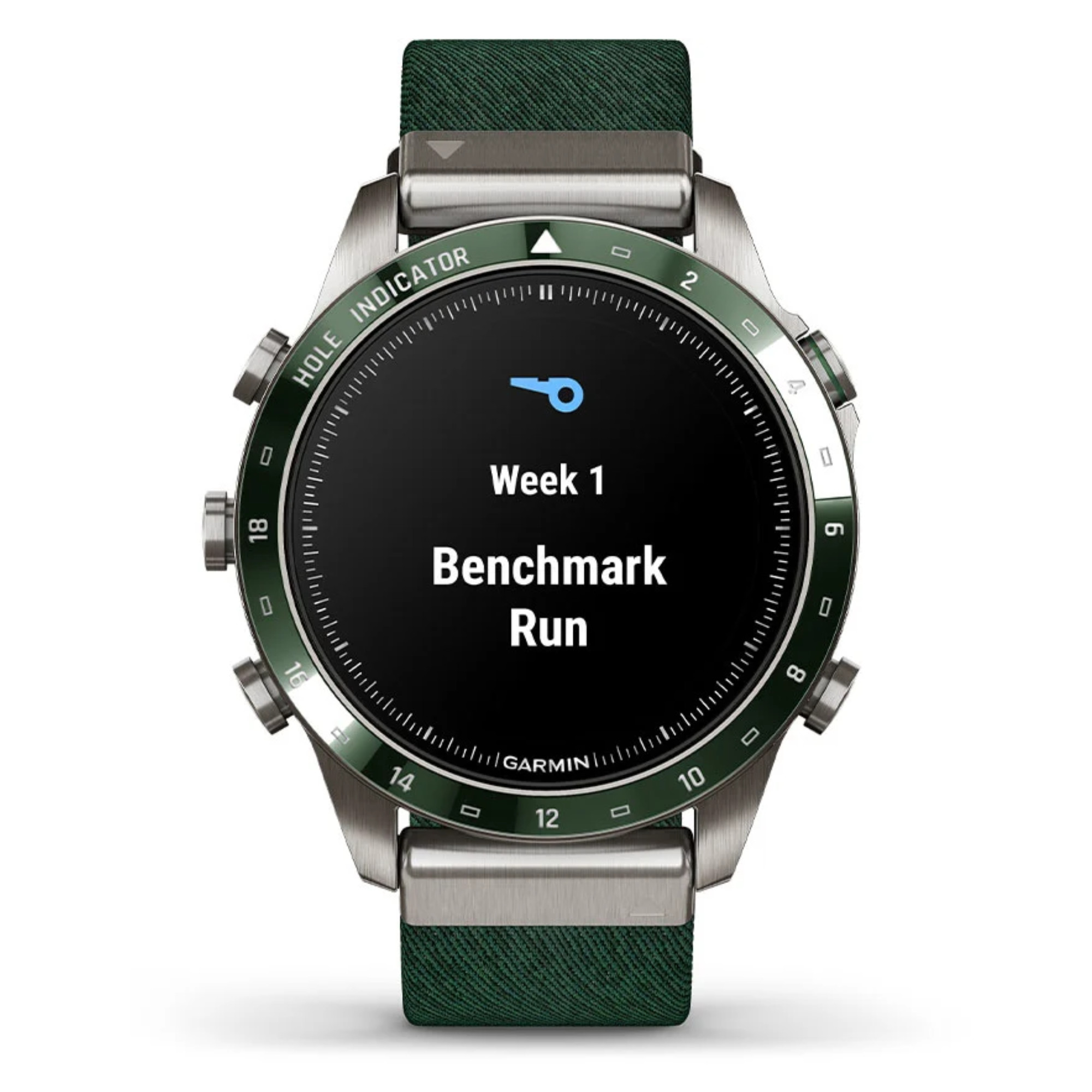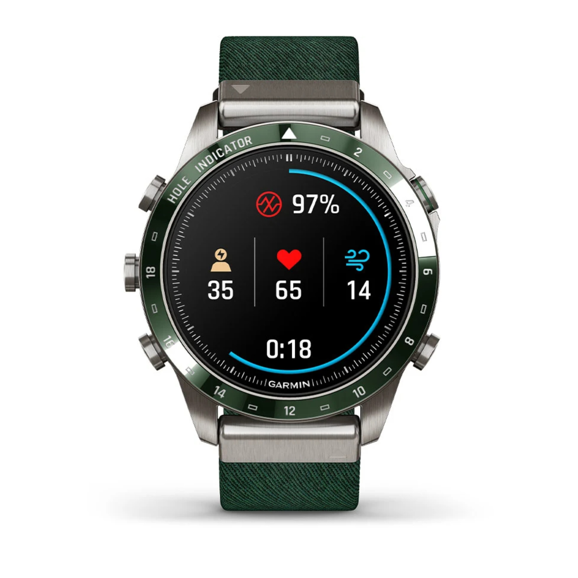 La marque Garmin nous présente sa toute nouvelle Marq Gen 2 ! Un grand pas en avant niveau technologie a été opéré dans ce modèle Golfer dont le passage du titane 2 au titane 5 et l'écran AMOLED de 1,2". La montre comprend un bracelet en nylon vert et un bracelet en silicone vert.