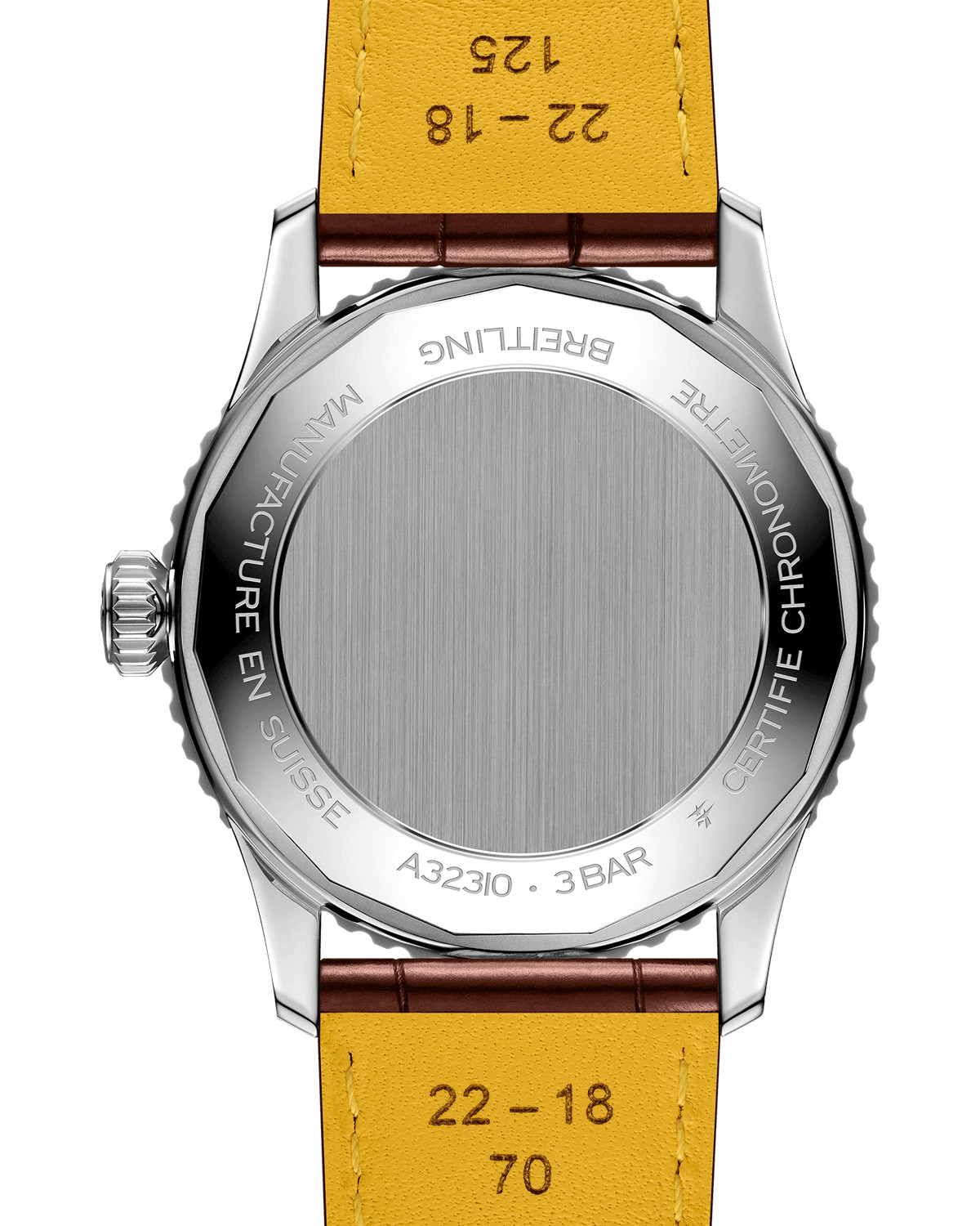 Son boîtier en acier inoxydable de 41 mm est complété par un bracelet en cuir d'alligator brun, ajoutant une touche de sophistication à ce garde-temps emblématique. Le cuir d’alligator, luxueux et résistant, apporte un confort optimal tout en soulignant l’allure classique et distinguée de la montre. Le mariage subtil entre le cadran argenté, le boîtier en acier et le bracelet brun confère à la Navitimer GMT un équilibre parfait entre robustesse et raffinement, faisant d’elle un accessoire aussi adapté aux voyages qu’aux occasions formelles.