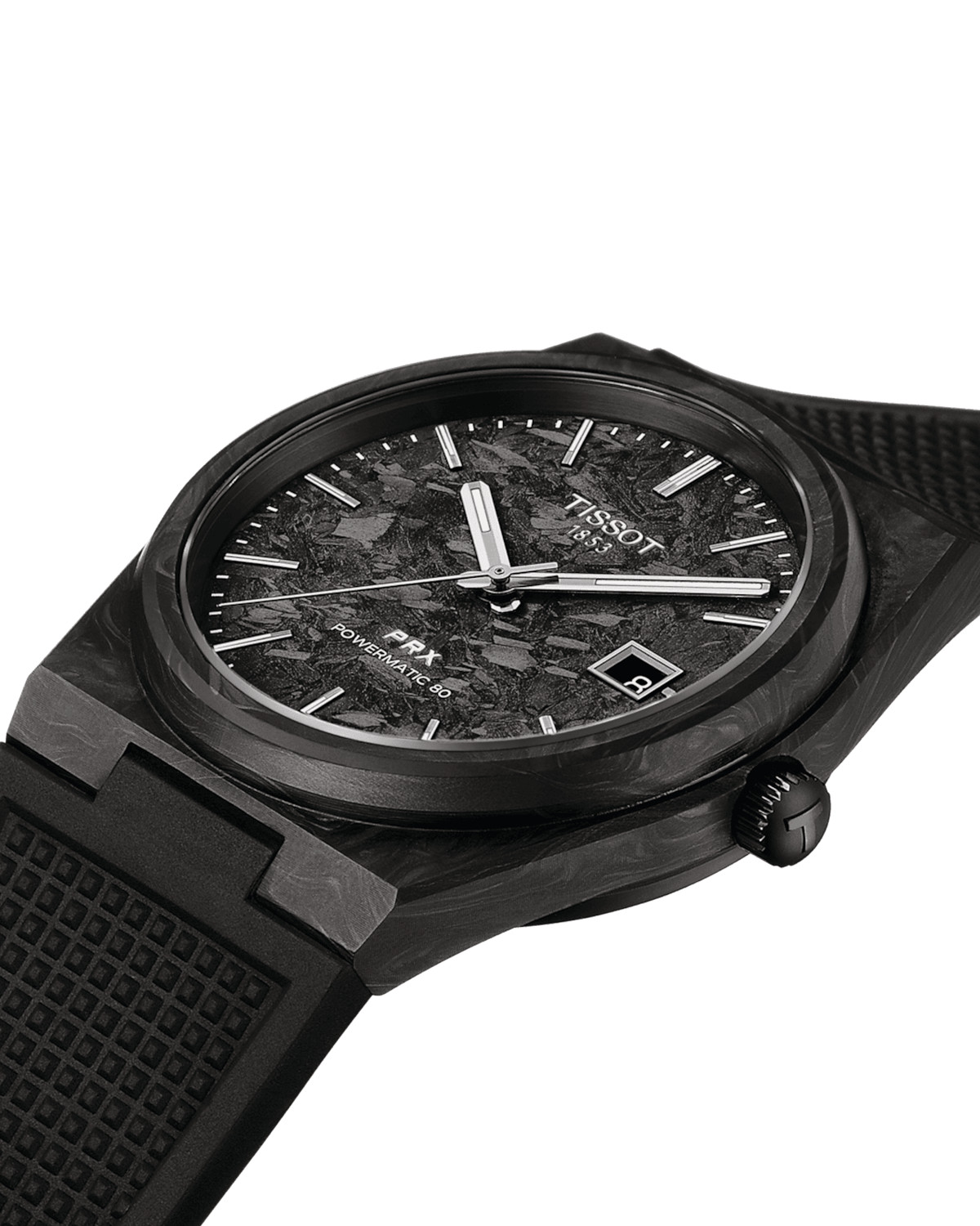 Le cadran en carbone noir de la Tissot PRX Carbone Powermatic 80 est la véritable pièce maîtresse de cette montre. Son motif distinctif donne à ce modèle un aspect texturé et résistant, tout en reflétant la lumière de manière subtile et sophistiquée. Le cadran est doté d'index appliqués et d'aiguilles luminescentes, garantissant une lisibilité optimale en toutes circonstances. Le mariage du noir carbone avec le boîtier en carbone forgé marbré noir et gris avec fond en acier inoxydable 316L avec revêtement pvd noir apporte un équilibre parfait entre robustesse et élégance moderne.