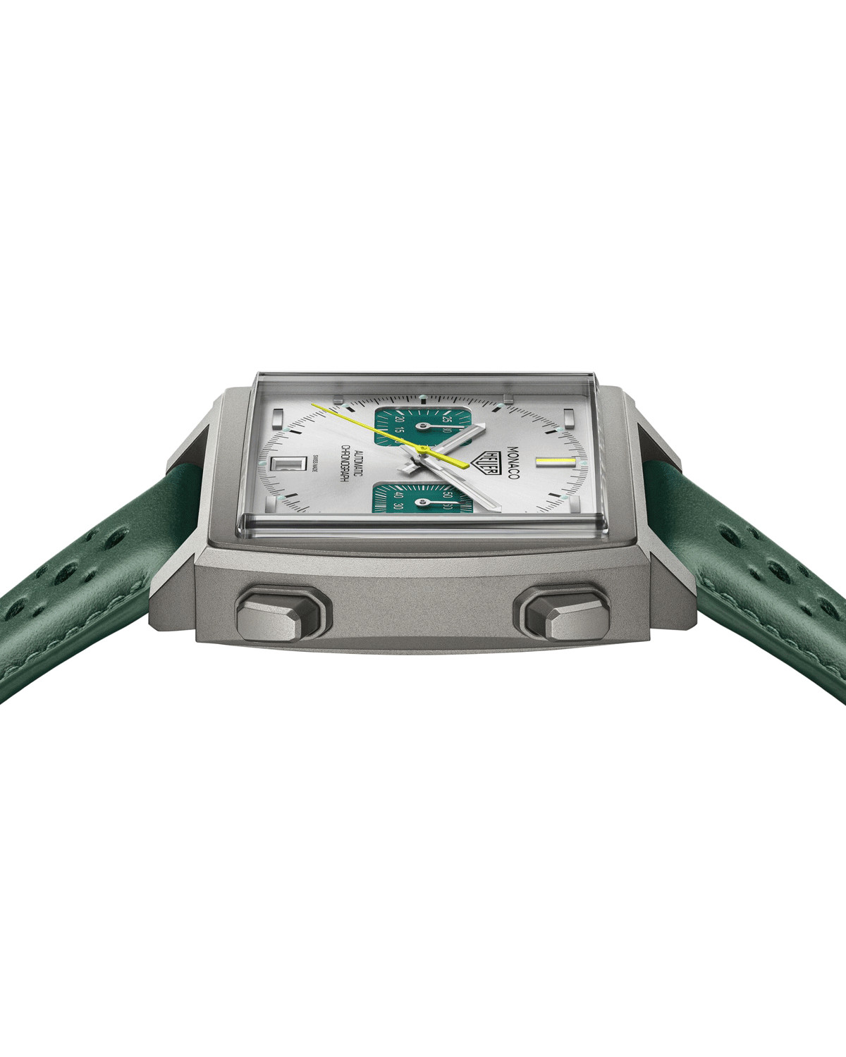 Chaque pays disposait ainsi de sa propre couleur : le Rosso Corsa pour l’Italie, le blanc qui céda ensuite sa place au gris métallique pour l’Allemagne, ou encore une nuance spécifique de bleu pour la France, un coloris adopté l’an dernier pour la Monaco Chronograph Racing Blue. À l’occasion de ce nouveau chapitre, c’est le célèbre British Racing Green qui sert d’inspiration pour la TAG Heuer Monaco Chronograph Racing Green, la toute dernière création de la Maison.