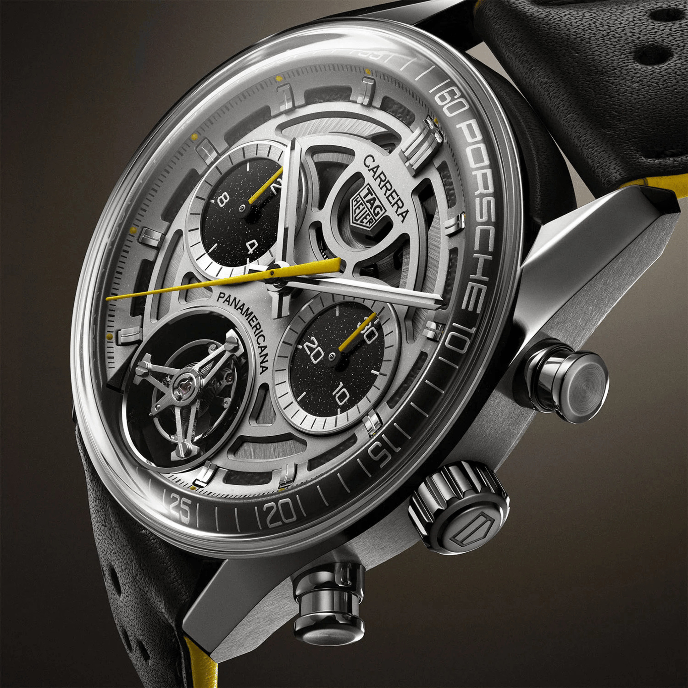 Le design de cette nouvelle TAG Heuer Carrera Chronograph Tourbillon x Porsche Panamericana est hommage vibrant à l'iconique Porsche 550 Spyder, avec un design inspiré de la célèbre voiture de course. On y retrouve de nombreux clins d’œil, comme le cadran squeletté qui évoque les jantes de la 550 Spyder, tandis que le coloris argenté, jaune et noir reprend les couleurs du bolide d’origine. La trotteuse et les aiguilles jaunes laquées des sous-cadrans insufflent à la montre une touche de sportivité supplémentaire.