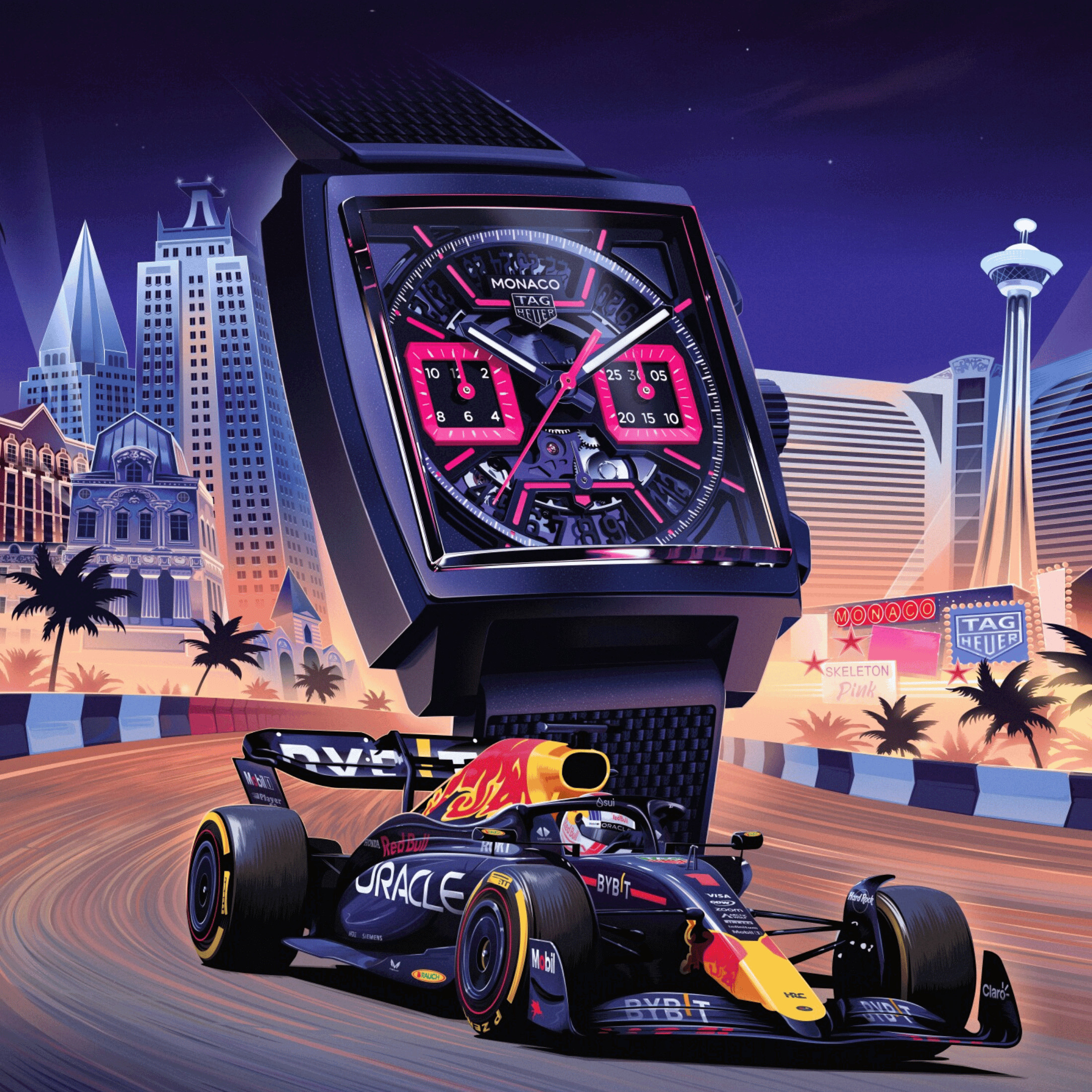Associé depuis longtemps au sport automobile, TAG Heuer continue de cultiver son héritage avec ses célèbres collections Carrera et Monaco. Lancée en 1969, la collection Monaco est l'une des montres chronographes les plus emblématiques de l'histoire horlogère et a même été un terrain d'innovation ces dernières années. Récemment, TAG Heuer a introduit au sein de cette collection, une version « Haute Horlogerie » avec la complication reine du chronographe : la Rattrapante. À l'approche du Grand Prix de Formule 1 de Las Vegas 2024, la Manufacture, sans surprise, présente une nouvelle version de son chronographe Monaco Skeleton : « The Pink ». Préparez-vous car elle raconte une histoire ! Lorsque le soleil se couche sur l'horizon éblouissant de Las Vegas, illuminant le célèbre Strip dans un kaléidoscope de couleurs, l'essence de la ville prend vie. C'est un lieu où règnent l'excitation et le jeu, où le pouls de la vie bat au rythme de l'excitation et de l'aventure. Pour célébrer cette atmosphère énergique, TAG Heuer est fier de présenter cette itération du TAG Heuer Monaco Chronograph.