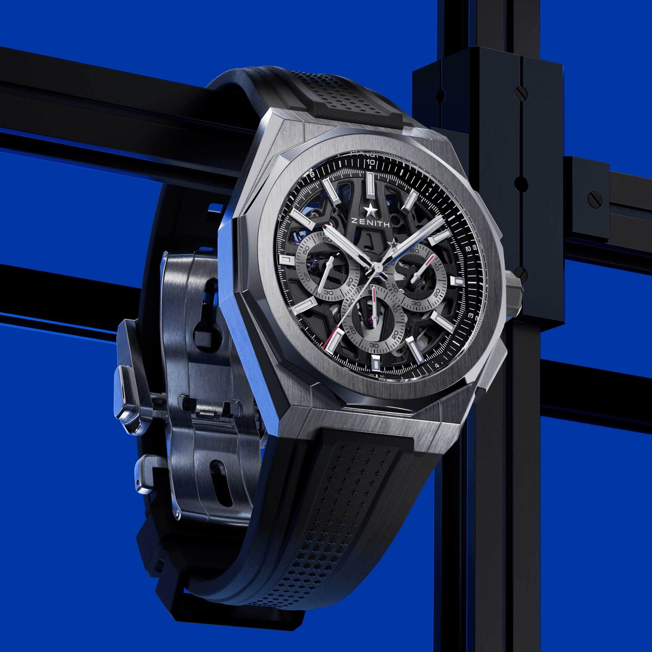Dans un monde qui évolue de plus en plus vite, chaque fraction de seconde compte. Comme dans la DEFY Skyline automatique et sa version squelette, ZENITH propose l’indication des dixièmes de seconde : dans la DEFY Skyline Chronograph, elle s’effectue via une aiguille de chronographe. Cette prouesse mécanique relève du calibre à haute fréquence El Primero 3600, cadencé à 5 Hz (36'000 alternances par heure), visible à travers le fond du boîtier. La masse oscillante à remontage bidirectionnel, ajourée en forme d'étoile, assure avec efficacité 60 heures de réserve de marche.