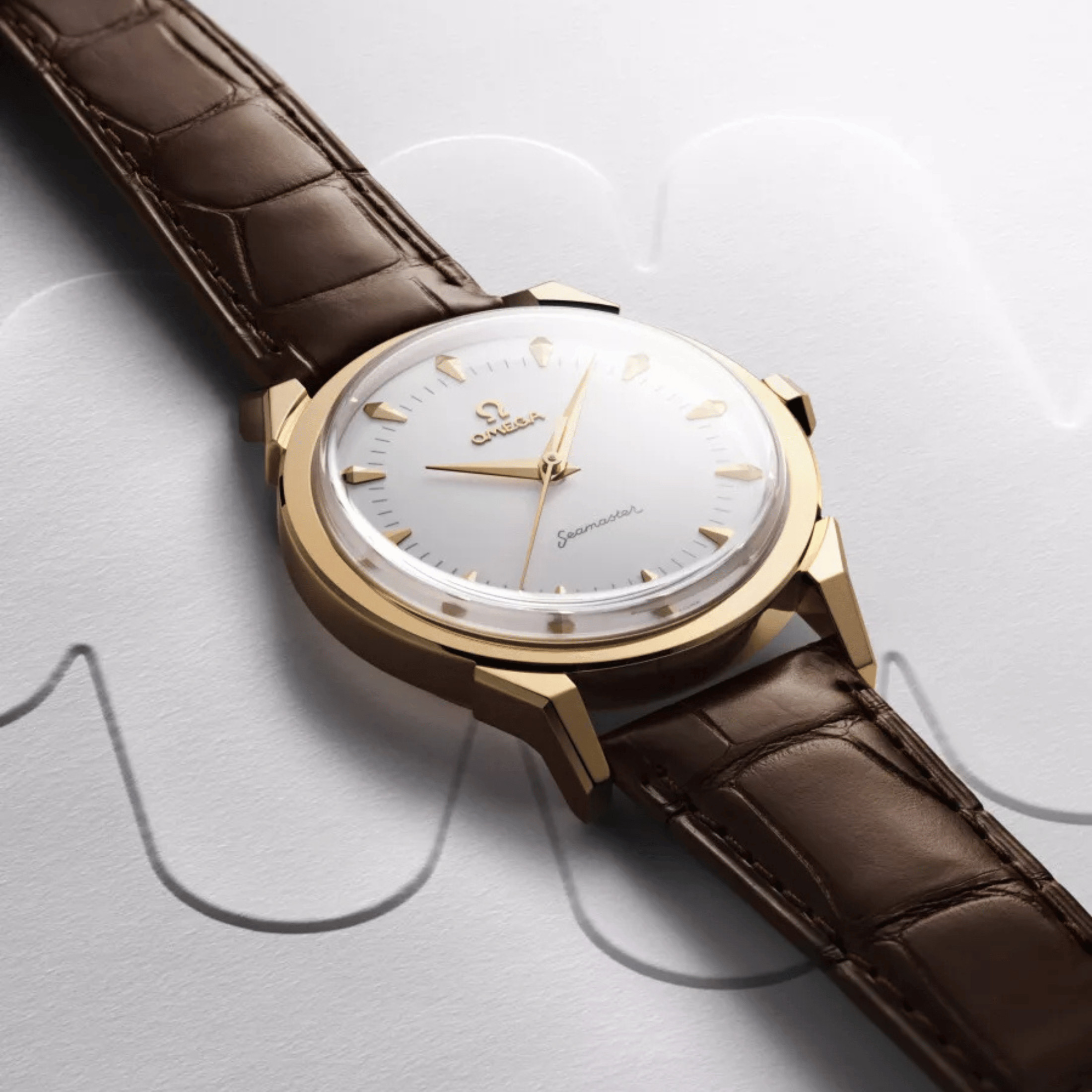 Omega a choisi de rester fidèle à ses origines tout en adoptant une approche plus épurée. Exit la Croix du Mérite et les chiffres romains appliqués, place à un cadran blanc bombé, net et épuré. Les index, sculptés avec précision, sont en or Moonshine, tout comme les aiguilles Dauphine polies au diamant et le logo Omega vintage.