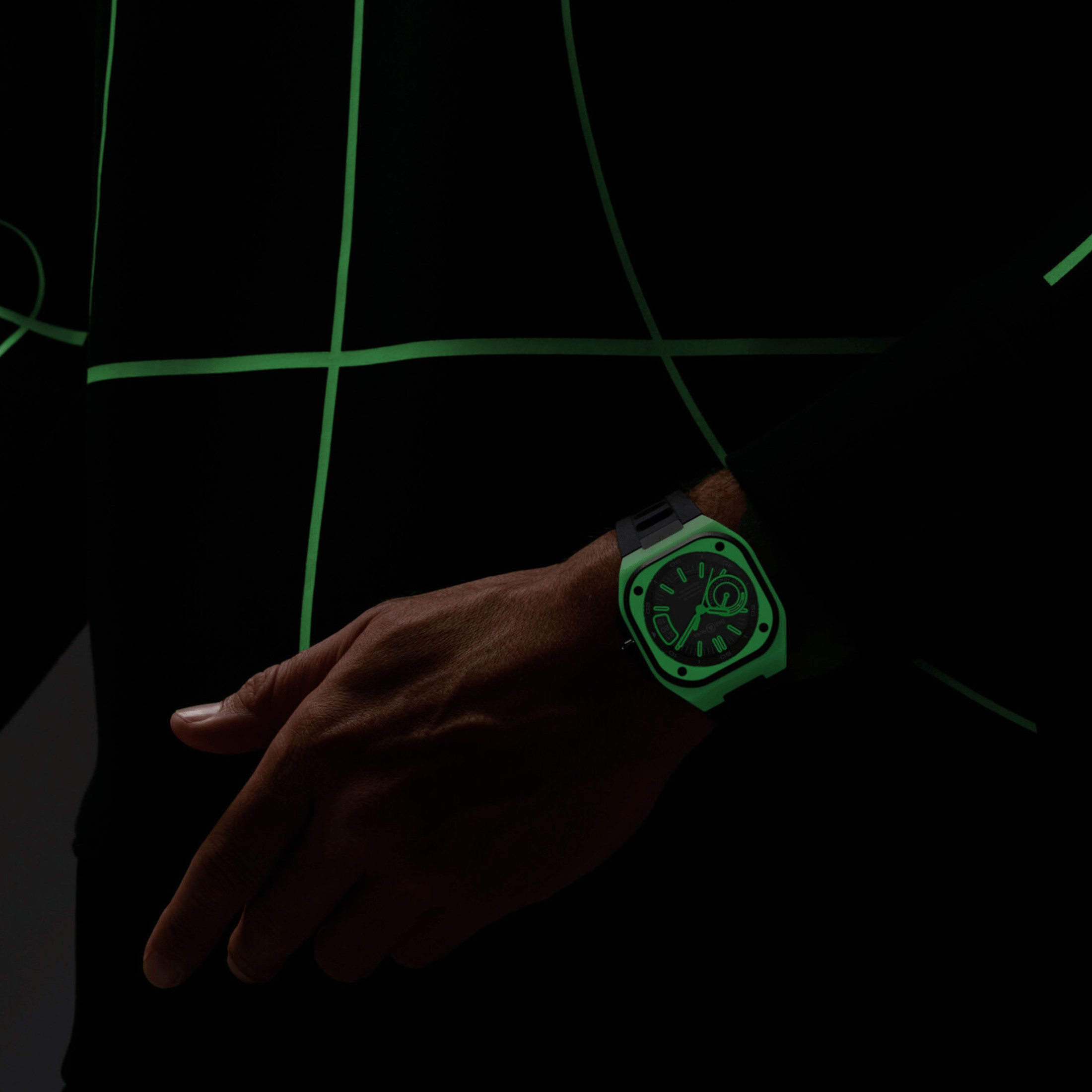 Taillé dans un bloc de titane grade 2 traité DLC, le container abritant le mécanisme s’insère entre deux boucliers façonnés dans un matériau composite photoluminescent, le LM3D, réalisé à partir de fibres de quartz diffusant une puissante luminescence verte. Ainsi, dans l’obscurité, c’est l’ensemble du boîtier qui brille pour souligner les indications figurant sur le cadran : heures, minutes, secondes, date et réserve de marche. Au-delà de sa fonction horlogère, la nouvelle BR-X5 GREEN LUM, éditée en série limitée de 500 exemplaires, accède par cette innovation au rang d’objet d’art conceptuel unique en son genre.