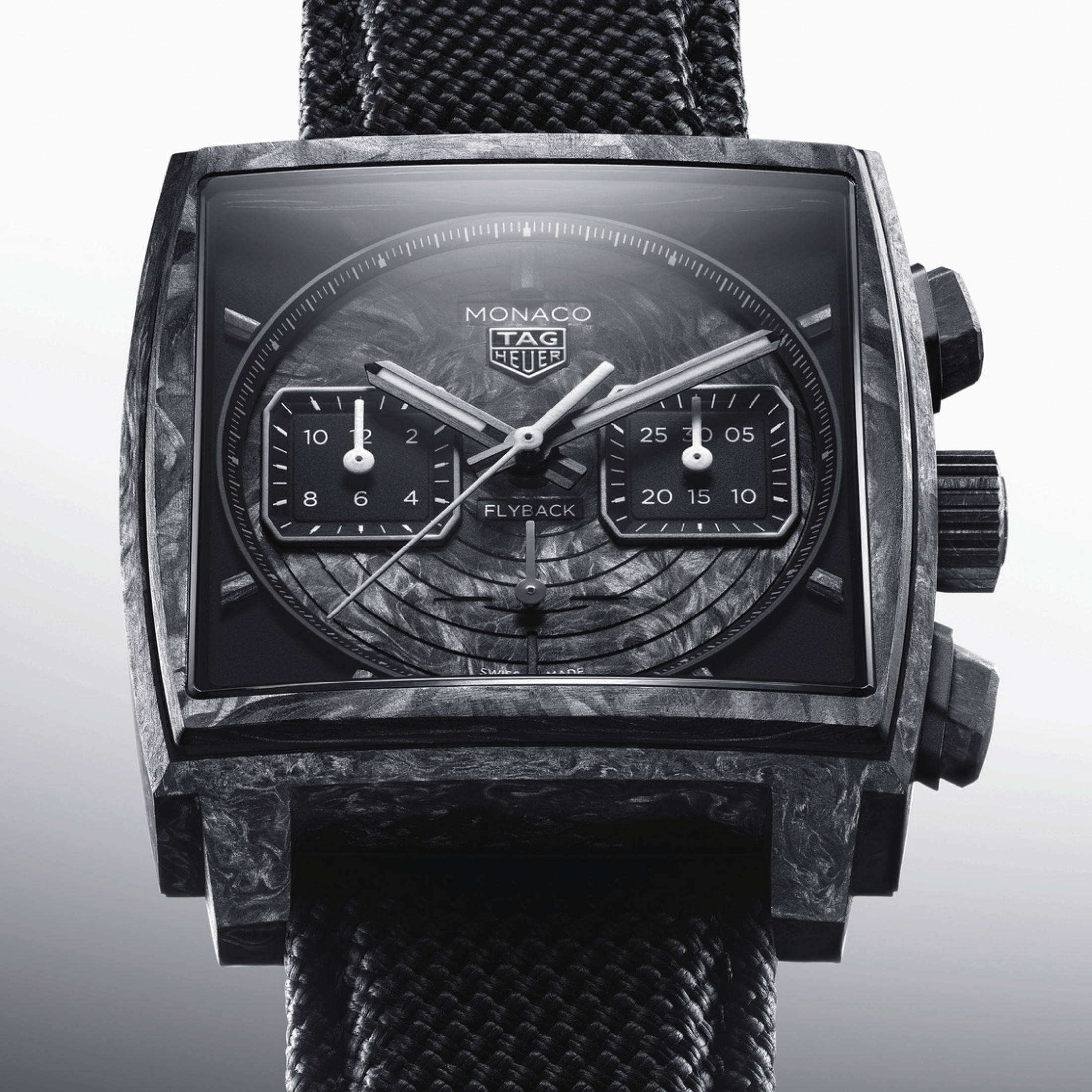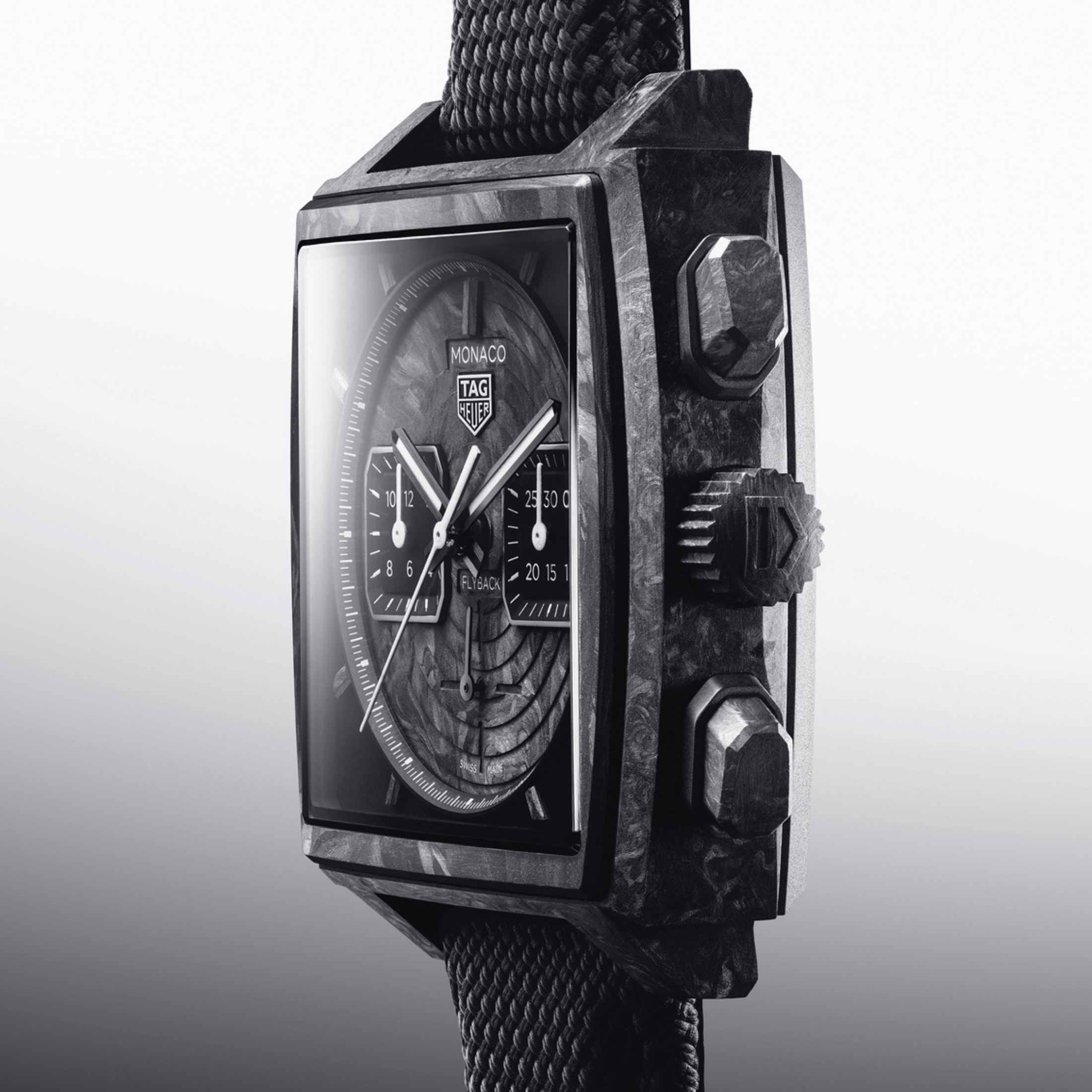 Le boîtier de 39 mm, fidèle aux proportions originelles de la Monaco, est réalisé en carbone forgé noir. Léger et résistant, ce matériau de pointe est constitué de fibres de carbone compressées et chauffées pour former une structure unique. Chaque pièce présente ainsi un motif veiné aléatoire, faisant de chaque exemplaire une montre véritablement unique au monde.