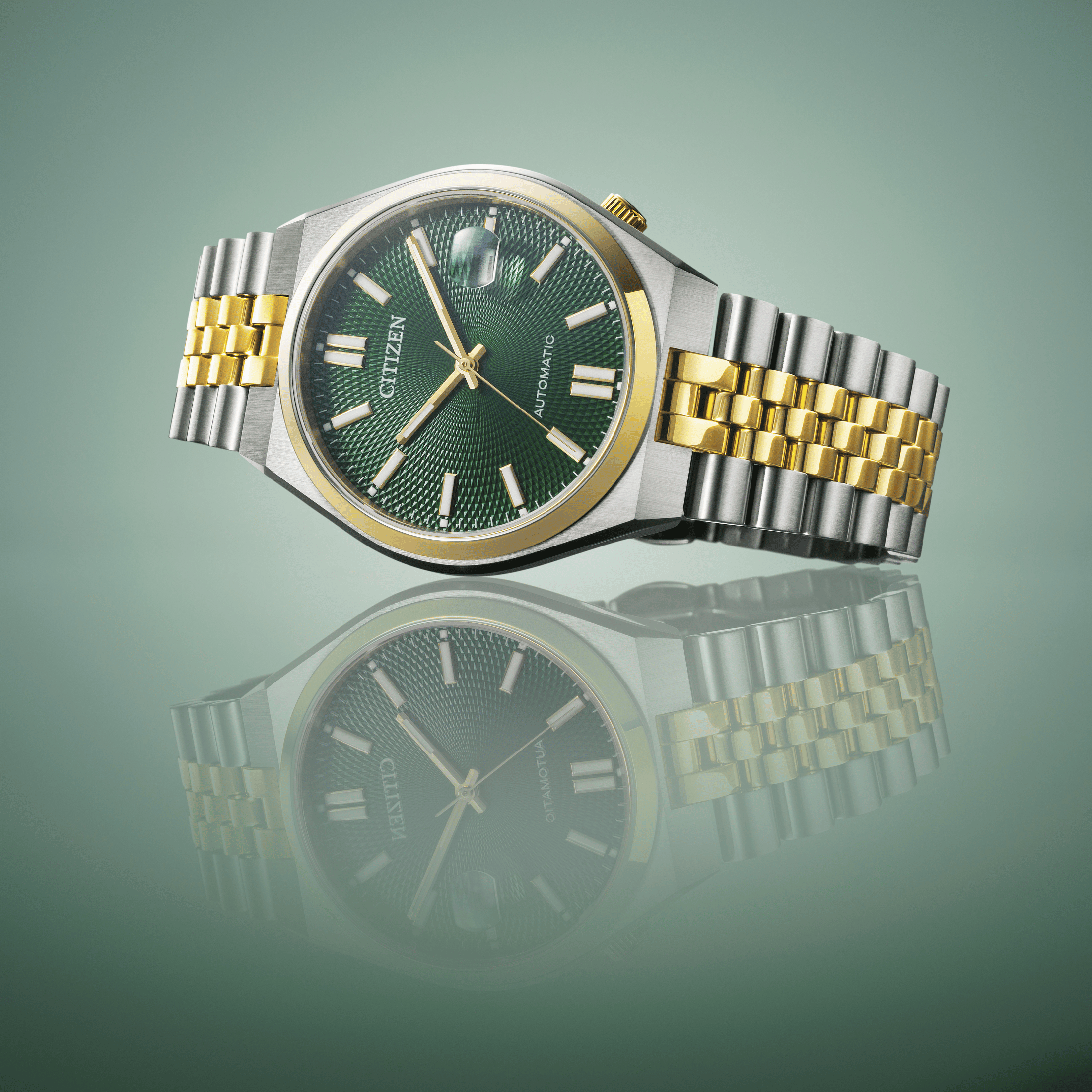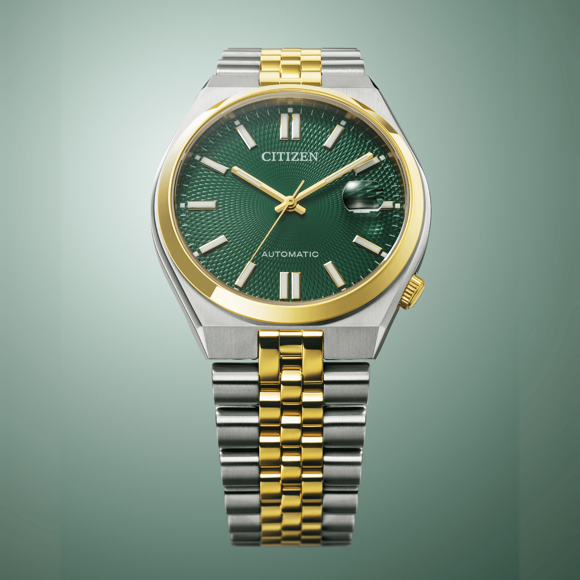Montre Citizen Tsuyosa 60 automatique cadran vert sapin bracelet acier et PVD or jaune 40 mm