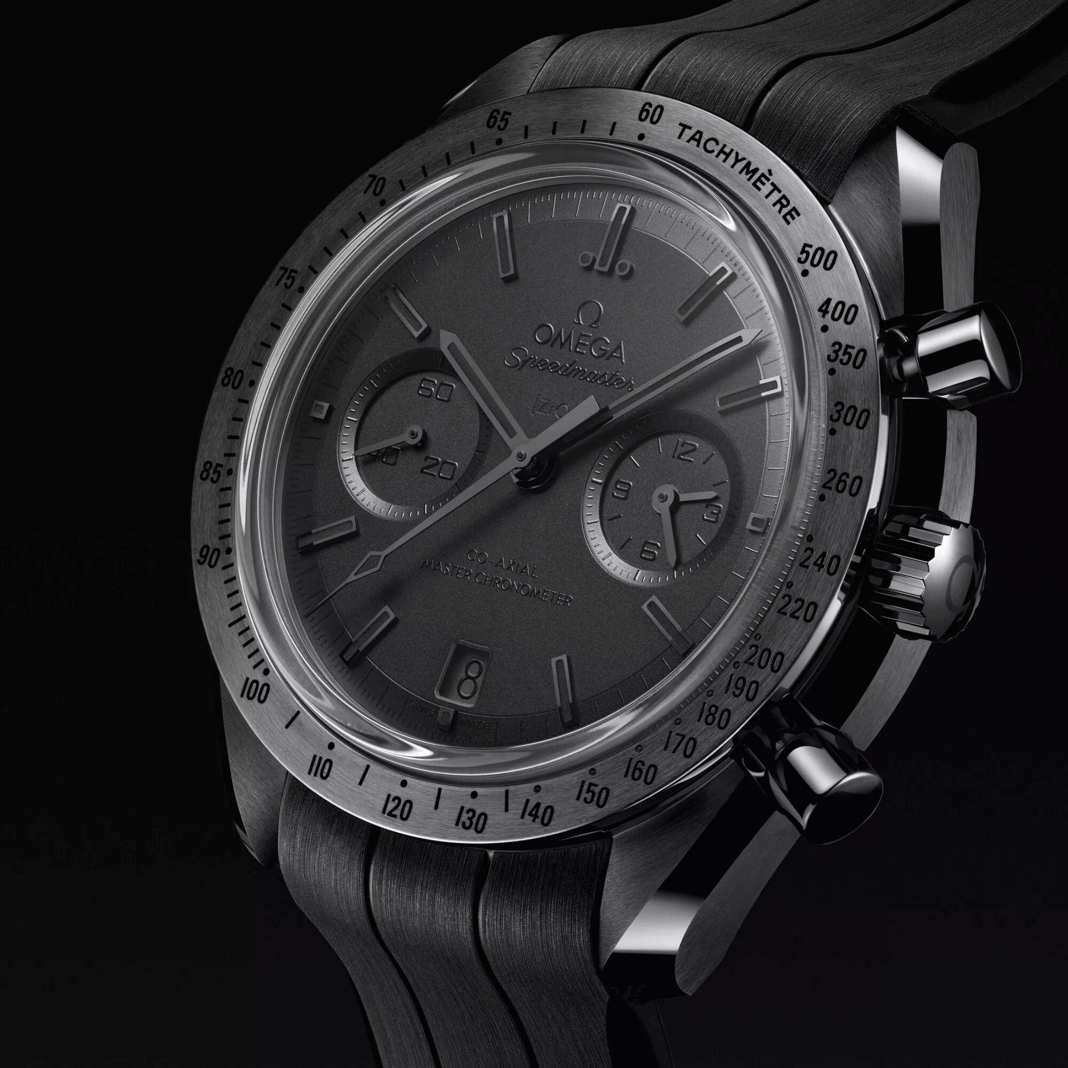 Totalement immergée dans l’obscurité, la Speedmaster Dark Side of the Moon “Black Black” 2025 pousse le concept à son extrême. Ici, tout est noir. Le boîtier de 44,25 mm est façonné dans une céramique d’oxyde de zirconium noire polie et satiné. Chaque surface absorbe la lumière, chaque facette semble taillée dans la nuit elle-même. Ce traitement confère à la montre une présence singulière : à la fois discrète, mystérieuse et d’une modernité radicale.