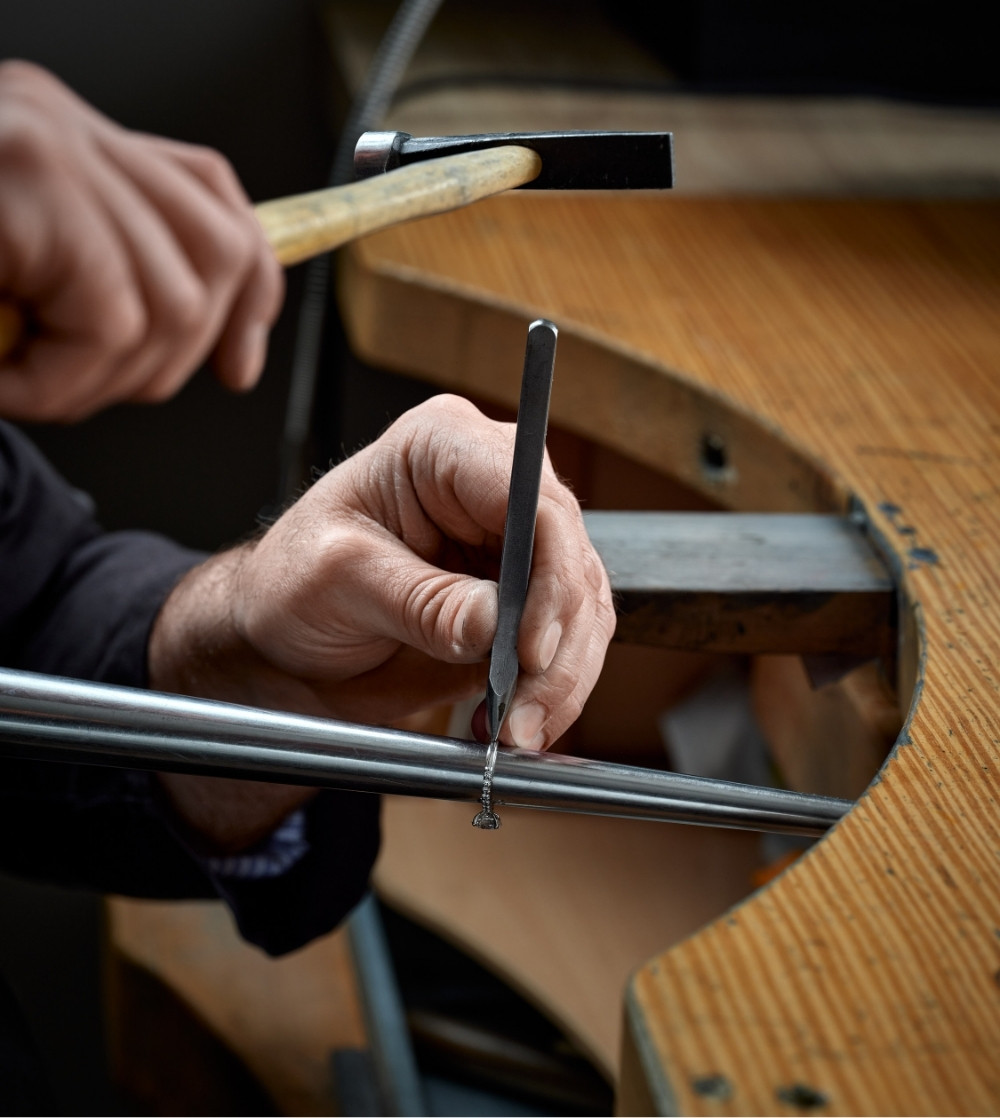 L’ultime étape créative consiste à frapper le bijou, à l’aide d’un petit marteau appelé le poinçon, afin de l’authentifier.