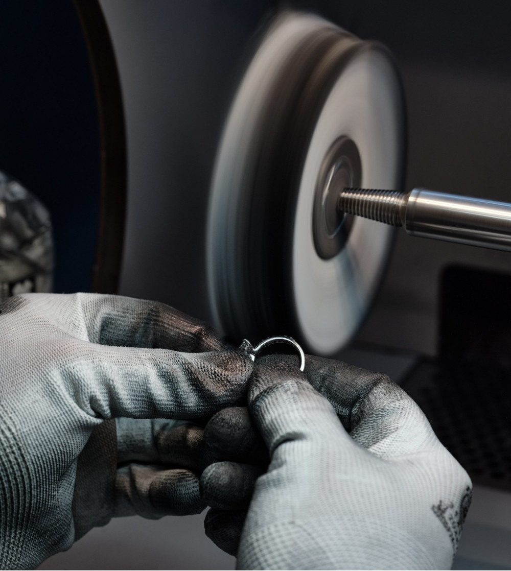 A ce stade, le travail de nos bijoutiers consiste à supprimer toutes les traces visibles laissées par les précédentes étapes de fabrication. Pour ce faire, la pièce passera dans plusieurs machines, puis sera brossée et embaumée de pâte à lustrer. Une fois le polissage effectué, si le bijou est en or blanc ou en platine, il sera plongé dans un bain de rhodium pendant quelques minutes, afin de figer, blanchir et renforcer son éclat blanc.