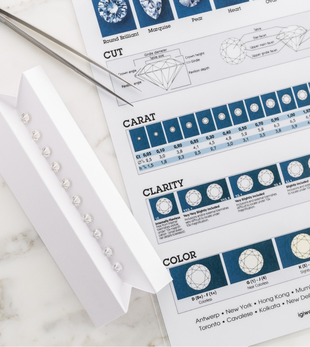 Chaque semaine, nos gemmologues se rendent à la célèbre bourse aux diamants d'Anvers, afin de sélectionner les pierres précieuses qui viendront sertir les bijoux. Chaque diamant est choisi en fonction de sa beauté et de sa qualité, selon des critères très précis, appelés les 4C : color (la couleur de la pierre), clarity (sa pureté), cut (sa taille) et carat (son poids). Toutes nos pierres d’un poids supérieur à 0,5 carat sont fournies avec un certificat HRD ou GIA, attestant de son authenticité, de sa qualité, et de sa traçabilité.